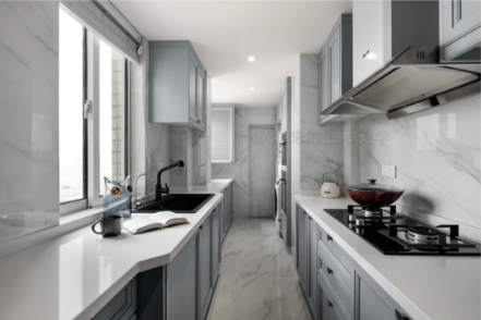 整體櫥柜一般組成可以分成柜體、臺面和柜門三個部分。柜體指的是吊柜和底柜。吊柜的柜體一般都以木材為主料,而底柜的選擇更多,除了木材的話,瓷磚、大理石都行。
