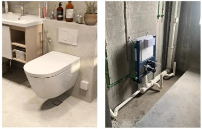 6.解決坑位問(wèn)題,原毛坯房馬桶坑距太靠邊,移位太長(zhǎng)會(huì)堵塞管道,利用壁掛馬桶直接改到主管,不堵塞。